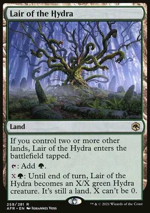 If you control two or more other lands, Lair of the Hydra enters the battlefield tapped. {T}: Add {G}. {X}{G}: Until end of turn, Lair of the Hydra becomes an X/X green Hydra creature. It's still a land. X can't be 0.