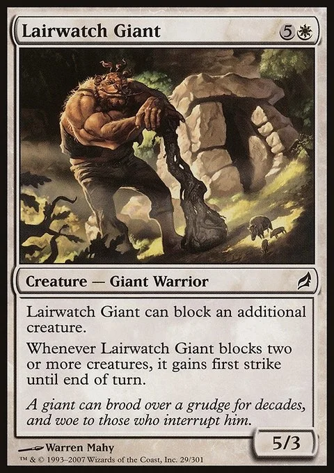 Lairwatch Giant can block an additional creature each combat. Whenever Lairwatch Giant blocks two or more creatures, it gains first strike until end of turn.
