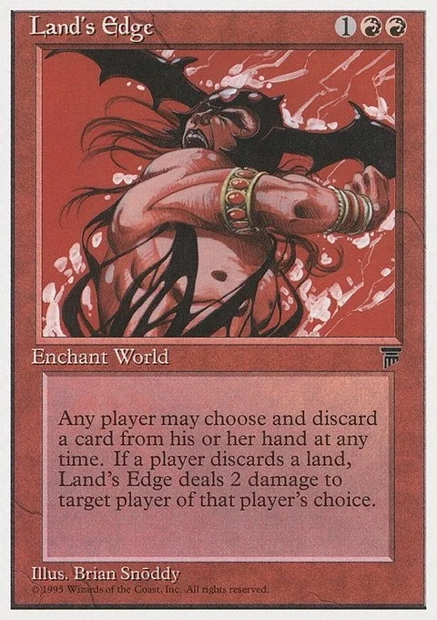 Any player may choose and discard a card from his or her hand at any time. If a player discards a land, Land’s Edge deals 2 damage to target player of that player’s choice.