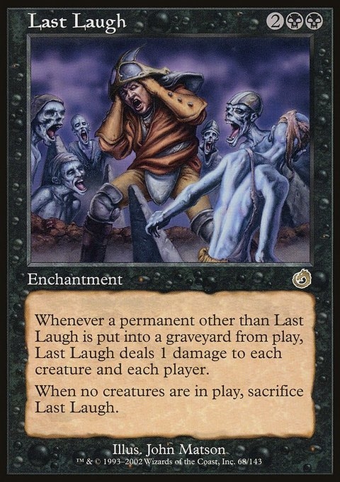 Whenever a permanent other than Last Laugh is put into a graveyard from the battlefield, Last Laugh deals 1 damage to each creature and each player. When no creatures are on the battlefield, sacrifice Last Laugh.
