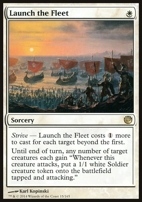 Strive — This spell costs {1} more to cast for each target beyond the first. Until end of turn, any number of target creatures each gain "Whenever this creature attacks, create a 1/1 white Soldier creature token that's tapped and attacking."