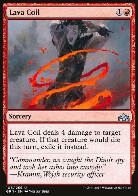 Lava Coil deals 4 damage to target creature. If that creature would die this turn, exile it instead.