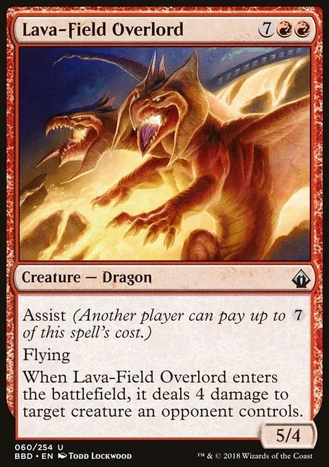 Assist (Another player can pay up to {7} of this spell's cost.) Flying When Lava-Field Overlord enters the battlefield, it deals 4 damage to target creature an opponent controls.