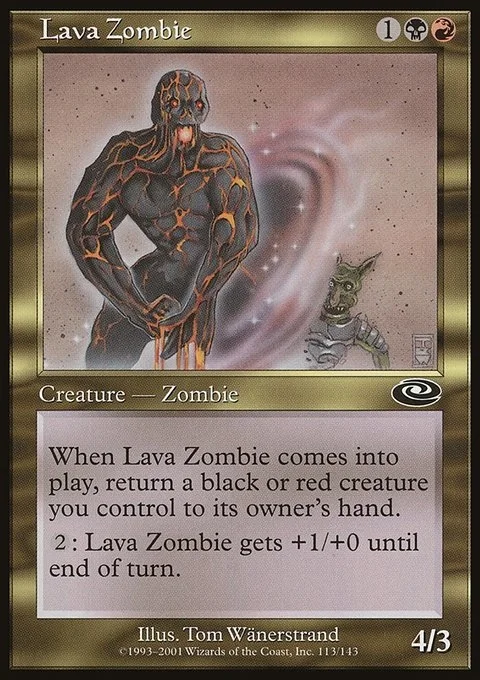 When Lava Zombie enters the battlefield, return a black or red creature you control to its owner's hand. {2}: Lava Zombie gets +1/+0 until end of turn.