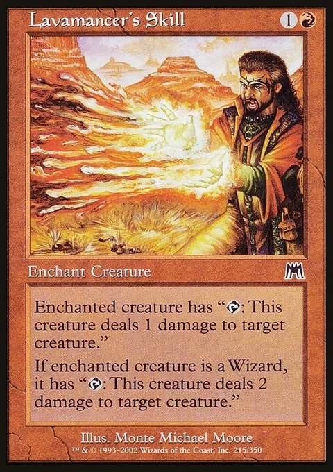 Enchant creature Enchanted creature has "{T}: This creature deals 1 damage to target creature." As long as enchanted creature is a Wizard, it has "{T}: This creature deals 2 damage to target creature."
