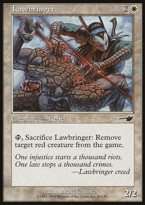 {T}, Sacrifice Lawbringer: Exile target red creature.