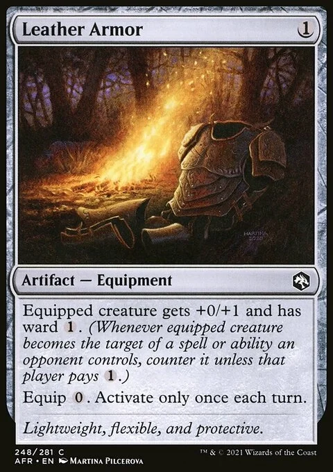 Equipped creature gets +0/+1 and has ward {1}. (Whenever equipped creature becomes the target of a spell or ability an opponent controls, counter it unless that player pays {1}.) Equip {0}. Activate only once each turn.