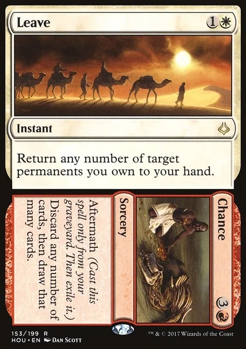 Leave Return any number of target permanents you own to your hand. Chance Aftermath (Cast this spell only from your graveyard. Then exile it.) Discard any number of cards, then draw that many cards.