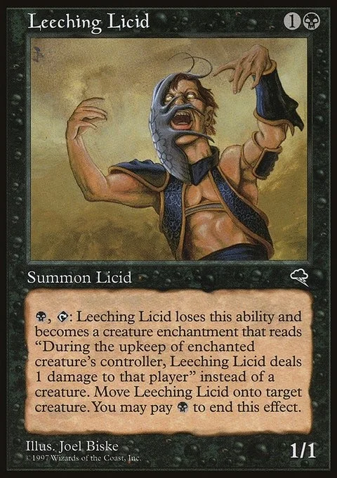 B, T: Leeching Licid loses this ability and becomes a creature enchantment that reads “During the upkeep of enchanted creature’s controller, Leeching Licid deals 1 damage to that player” instead of a creature. Move Leeching Licid onto target creature. You may pay B to end this effect.