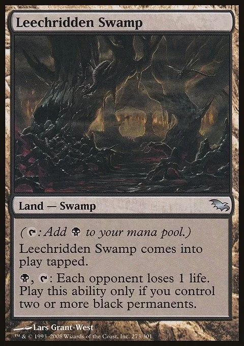 ({T}: Add {B}.) Leechridden Swamp enters the battlefield tapped. {B}, {T}: Each opponent loses 1 life. Activate only if you control two or more black permanents.