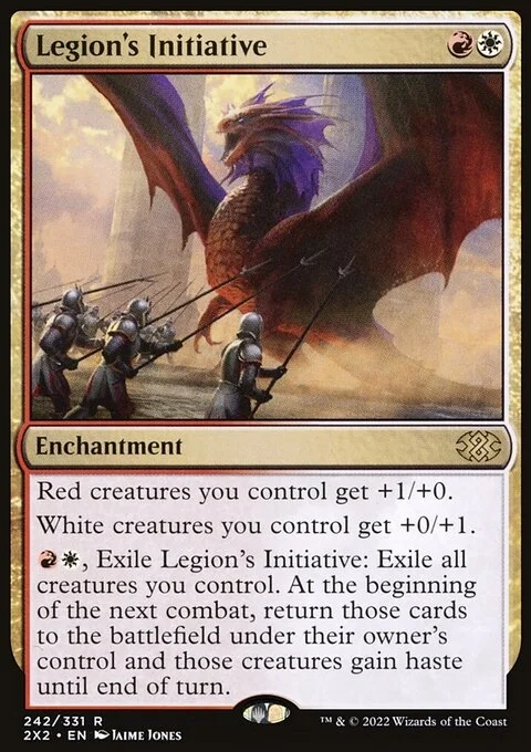 {R}{W}, Exile Legion's Initiative: Exile all creatures you control. At the beginning of the next combat, return those cards to the battlefield under their owner's control and those creatures gain haste until end of turn.