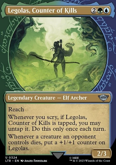 Reach Whenever you scry, if Legolas, Counter of Kills is tapped, you may untap it. Do this only once each turn. Whenever a creature an opponent controls dies, put a +1/+1 counter on Legolas.