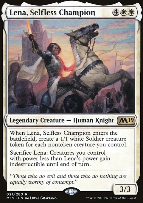 When Lena, Selfless Champion enters the battlefield, create a 1/1 white Soldier creature token for each nontoken creature you control. Sacrifice Lena: Creatures you control with power less than Lena's power gain indestructible until end of turn.