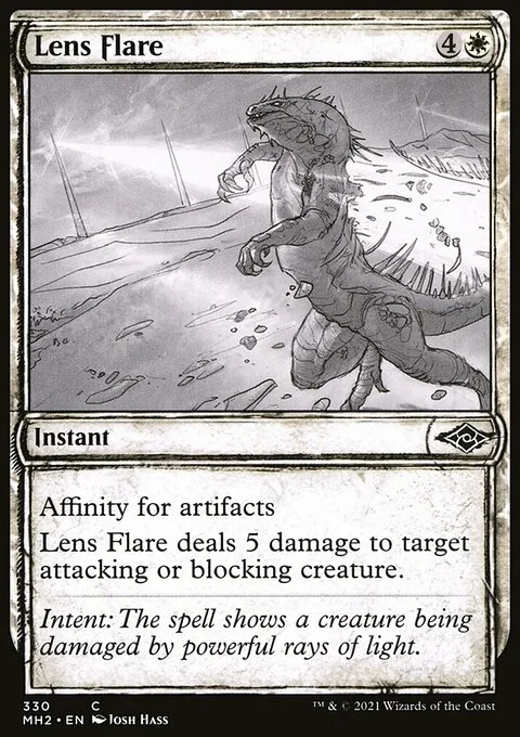 Affinity for artifacts (This spell costs {1} less to cast for each artifact you control.) Lens Flare deals 5 damage to target attacking or blocking creature.