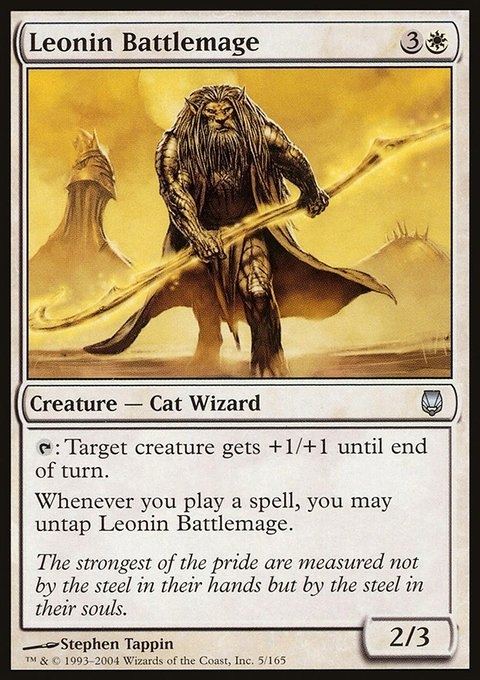 {T}: Target creature gets +1/+1 until end of turn. Whenever you cast a spell, you may untap Leonin Battlemage.