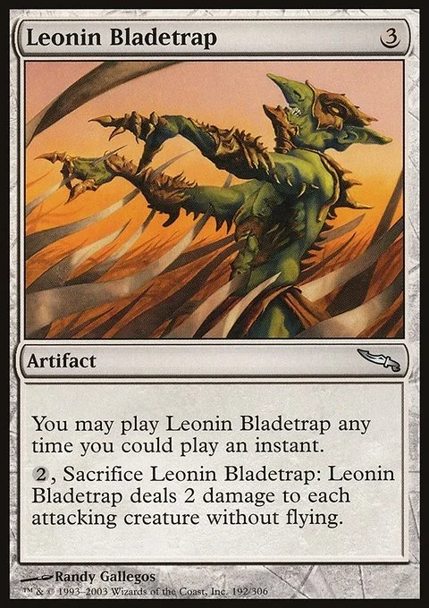 Flash (You may cast this spell any time you could cast an instant.) {2}, Sacrifice Leonin Bladetrap: It deals 2 damage to each attacking creature without flying.