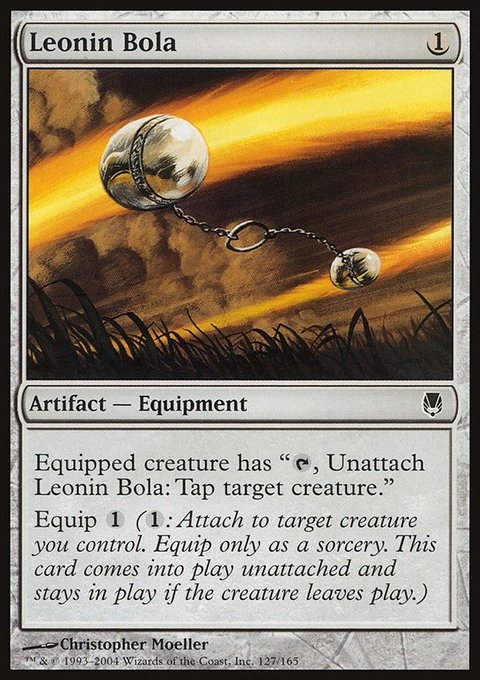 Equipped creature has "{T}, Unattach Leonin Bola: Tap target creature." Equip {1} ({1}: Attach to target creature you control. Equip only as a sorcery. This card enters unattached and stays on the battlefield if the creature leaves.)