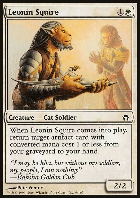 When Leonin Squire enters, return target artifact card with mana value 1 or less from your graveyard to your hand.