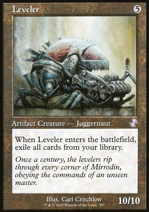 When Leveler enters the battlefield, exile all cards from your library.