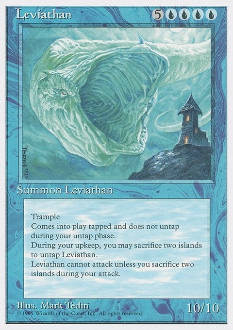 Comes into play tapped and does not untap during your untap phase.During your upkeep, you may sacrifice two islands to untap Leviathan. Leviathan cannot attack unless you sacrifice two islands during your attack.