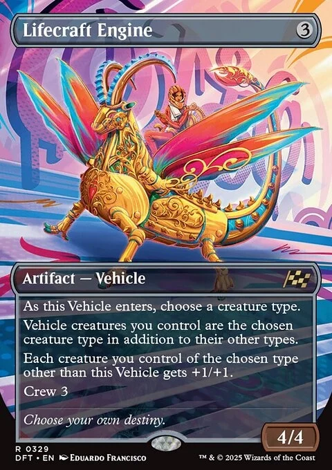 As this Vehicle enters, choose a creature type. Vehicle creatures you control are the chosen creature type in addition to their other types. Each creature you control of the chosen type other than this Vehicle gets +1/+1. Crew 3
