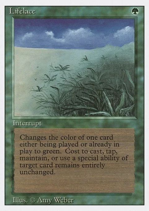 Changes the color of one card either being played or already in play to green. Cost to cast, tap, maintain, or use a special ability of target card remains entirely unchanged.