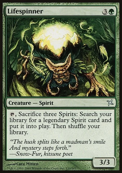 {T}, Sacrifice three Spirits: Search your library for a legendary Spirit permanent card, put it onto the battlefield, then shuffle.