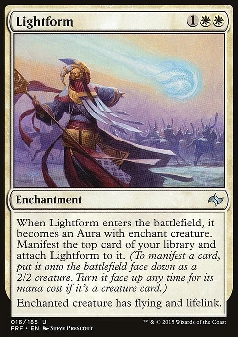When Lightform enters the battlefield, it becomes an Aura with enchant creature. Manifest the top card of your library and attach Lightform to it. (To manifest a card, put it onto the battlefield face down as a 2/2 creature. Turn it face up any time for its mana cost if it's a creature card.)