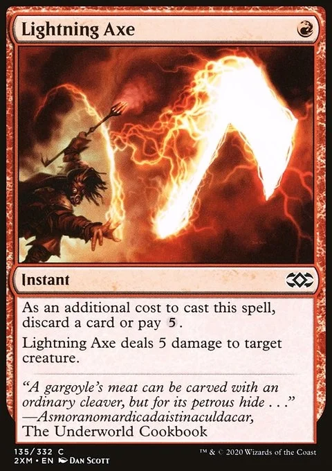 As an additional cost to cast this spell, discard a card or pay {5}. Lightning Axe deals 5 damage to target creature.