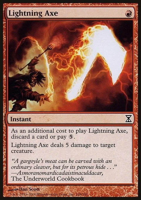 As an additional cost to cast this spell, discard a card or pay {5}. Lightning Axe deals 5 damage to target creature.