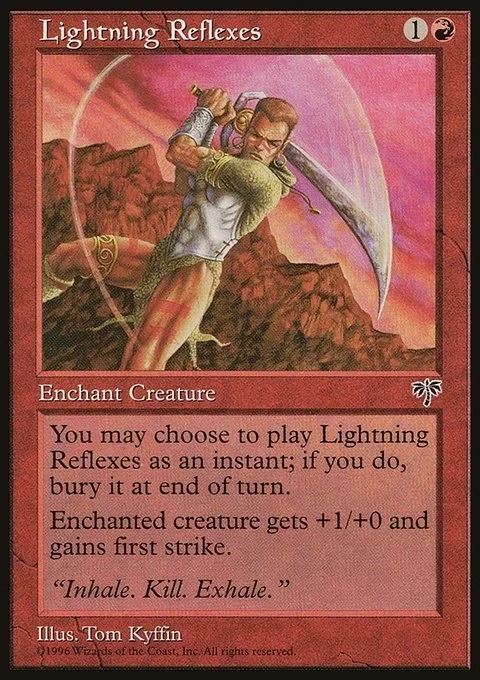 You may cast Lightning Reflexes as though it had flash. If you cast it any time a sorcery couldn't have been cast, the controller of the permanent it becomes sacrifices it at the beginning of the next cleanup step. Enchant creature Enchanted creature gets +1/+0 and has first strike.