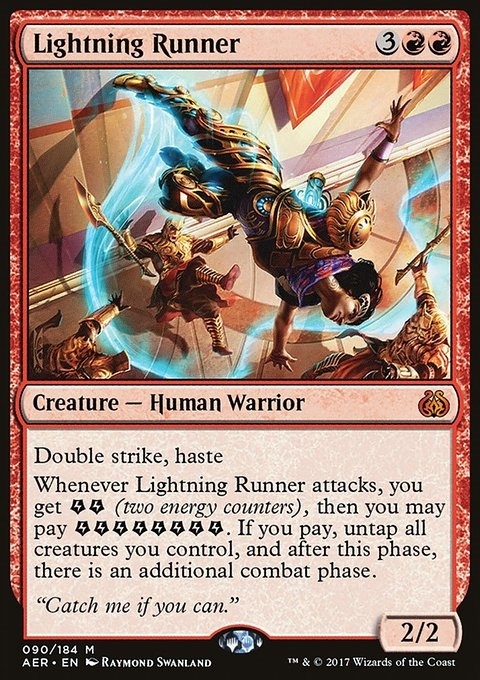 Double strike, haste Whenever Lightning Runner attacks, you get {E}{E} (two energy counters), then you may pay {E}{E}{E}{E}{E}{E}{E}{E}. If you pay, untap all creatures you control, and after this phase, there is an additional combat phase.