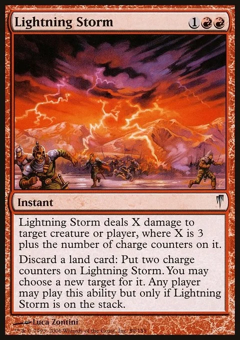 Lightning Storm deals X damage to any target, where X is 3 plus the number of charge counters on Lightning Storm. Discard a land card: Put two charge counters on Lightning Storm. You may choose a new target for it. Any player may activate this ability but only if Lightning Storm is on the stack.