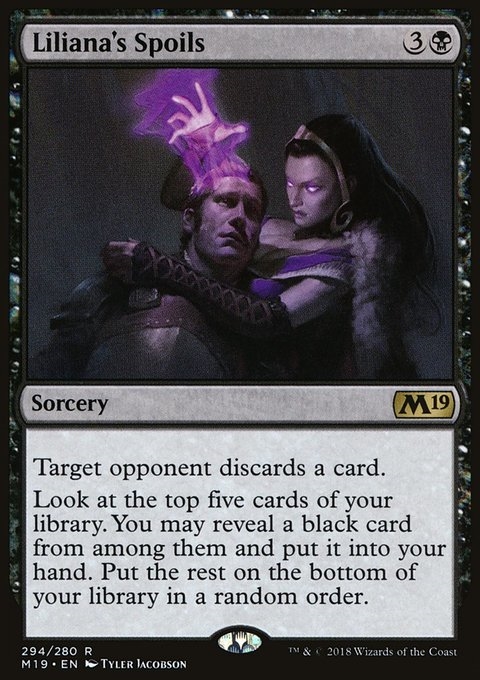 Target opponent discards a card. Look at the top five cards of your library. You may reveal a black card from among them and put it into your hand. Put the rest on the bottom of your library in a random order.