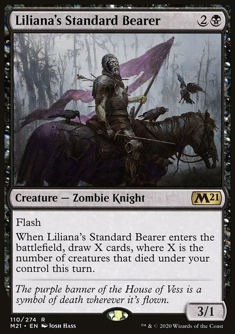Flash When Liliana's Standard Bearer enters the battlefield, draw X cards, where X is the number of creatures that died under your control this turn.