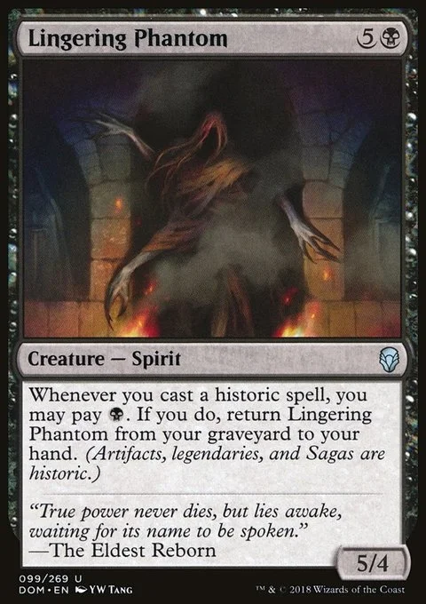 Whenever you cast a historic spell, you may pay {B}. If you do, return Lingering Phantom from your graveyard to your hand. (Artifacts, legendaries, and Sagas are historic.)