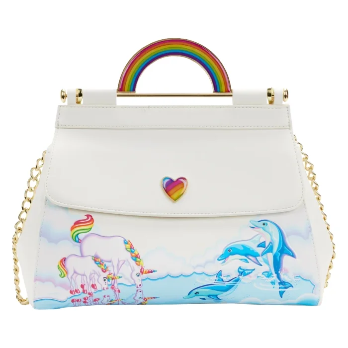 On the front, Markie and Celeste take a refreshing sip of water from a reflective lake where the Dancing Dolphins play. As they rest in the clouds, a bold and bright rainbow shines above on the bag’s molded handle. A dreamy cloud-shaped shoulder pad continues the magic on top of the shiny gold chain shoulder strap, which can be detached and modified depending on your unique sense of style. On the back, Markie and Celeste make an encore appearance along with some multi-colored hearts.