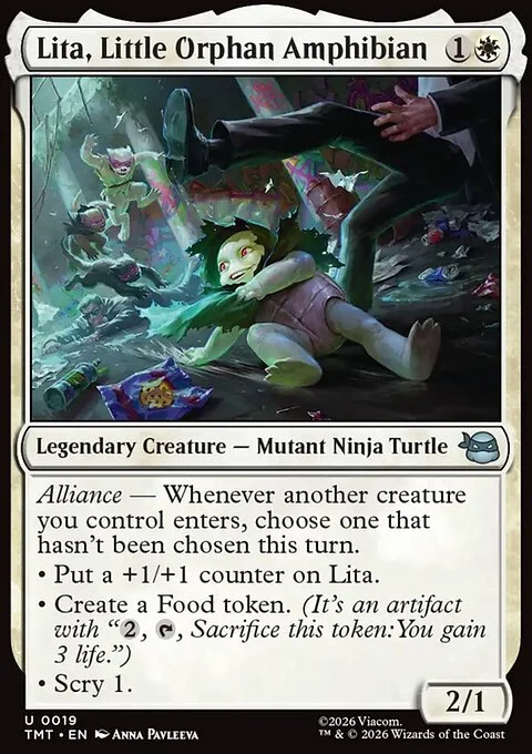 Alliance — Whenever another creature you control enters, choose one that hasn't been chosen this turn. • Put a +1/+1 counter on Lita. • Create a Food token. (It's an artifact with "{2}, {T}, Sacrifice this token: You gain 3 life.") • Scry 1.