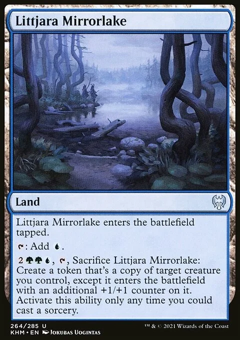 {2}{G}{G}{U}, {T}, Sacrifice Littjara Mirrorlake: Create a token that's a copy of target creature you control, except it enters the battlefield with an additional +1/+1 counter on it. Activate only as a sorcery.