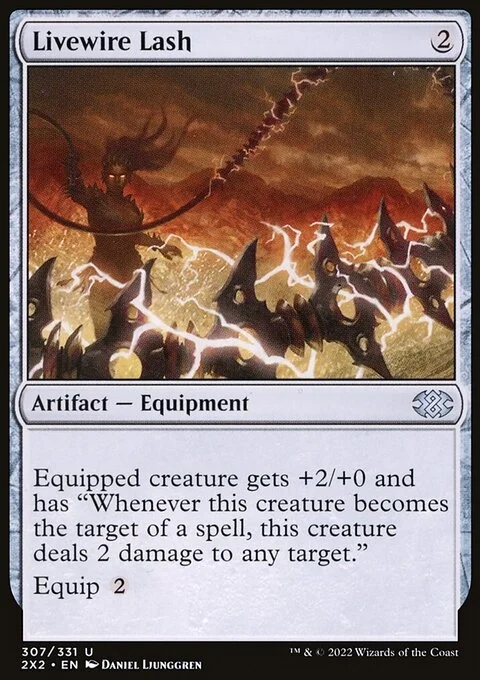 Equipped creature gets +2/+0 and has "Whenever this creature becomes the target of a spell, this creature deals 2 damage to any target." Equip {2}