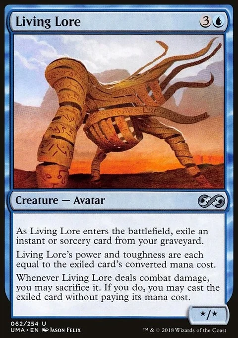 Whenever Living Lore deals combat damage, you may sacrifice it. If you do, you may cast the exiled card without paying its mana cost.