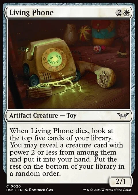 When this creature dies, look at the top five cards of your library. You may reveal a creature card with power 2 or less from among them and put it into your hand. Put the rest on the bottom of your library in a random order.