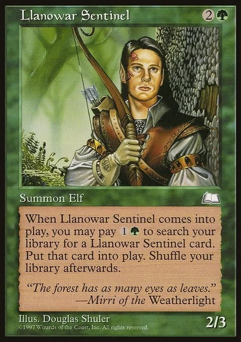 When Llanowar Sentinel enters the battlefield, you may pay {1}{G}. If you do, search your library for a card named Llanowar Sentinel, put that card onto the battlefield, then shuffle.