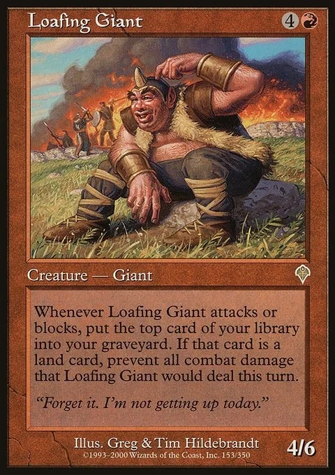 Whenever Loafing Giant attacks or blocks, put the top card of your library into your graveyard. If that card is a land card, prevent all combat damage that Loafing Giant would deal this turn.