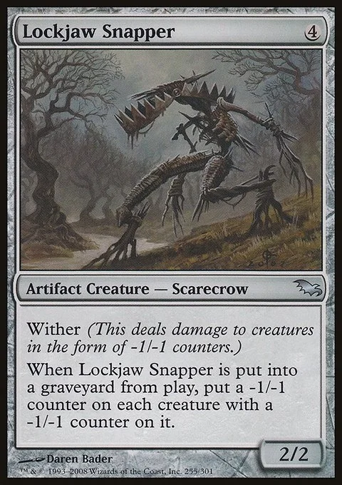 Wither (This deals damage to creatures in the form of -1/-1 counters.) When Lockjaw Snapper dies, put a -1/-1 counter on each creature with a -1/-1 counter on it.