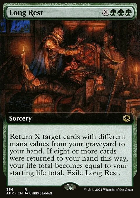 Return X target cards with different mana values from your graveyard to your hand. If eight or more cards were returned to your hand this way, your life total becomes equal to your starting life total. Exile Long Rest.