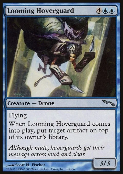 Flying When Looming Hoverguard enters the battlefield, put target artifact on top of its owner's library.