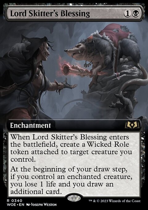 When Lord Skitter's Blessing enters, create a Wicked Role token attached to target creature you control. (Enchanted creature gets +1/+1. When this Aura is put into a graveyard, each opponent loses 1 life.)