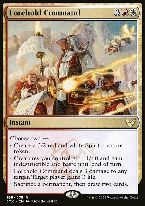 Choose two — • Create a 3/2 red and white Spirit creature token. • Creatures you control get +1/+0 and gain indestructible and haste until end of turn. • Lorehold Command deals 3 damage to any target. Target player gains 3 life. • Sacrifice a permanent, then draw two cards.