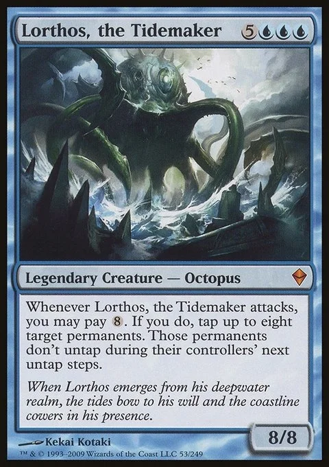 Whenever Lorthos, the Tidemaker attacks, you may pay {8}. If you do, tap up to eight target permanents. Those permanents don't untap during their controllers' next untap steps.